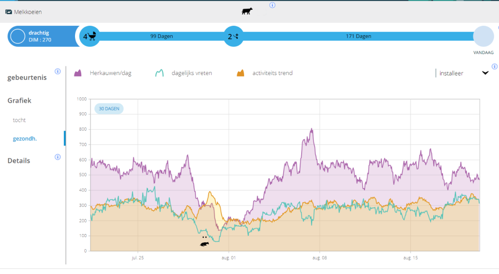 De kleinste veranderingen in individueel koe gedrag zijn vaak moeilijk te signaleren in een koppel. Toch wordt steeds duidelijker hoe belangrijk het is deze veranderingen wel serieus te nemen en deze attentie koeien te onderzoeken. Nederland en België zijn ook dit jaar weer in de greep van het Blauwtong virus. Immink: “Vaak heb je niet meteen door dat je koeien iets onder de leden hebben, maar deze zomer kreeg ik ineens allerlei meldingen via mijn SenseHub app binnen. Veel meer dan normaal. Bij alle meldingen zag ik een forse afwijking in het herkauw-, vreet en activiteitsgedrag. Die drie sensordata lieten echt een trendbreuk zien. Toen gingen bij mij wel even alle alarmbellen af. Ik heb daarop de dieren apart gezet onderzocht en direct geschakeld met mijn dierenarts. Zijn diagnose wees uit dat mijn koeien blauwtong hadden. Zonder SenseHub had ik nooit zo snel deze dieren kunnen onderzoeken en kunnen zien dat er wat aan de hand was.”